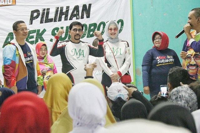 Warga yang hadir kompak mengenakan pakaian serba putih bertulis nama Calon Wali Kota Surabaya Cak Machfud dan dibelakang bajunya bergambar muka jenderal bintang dua itu.